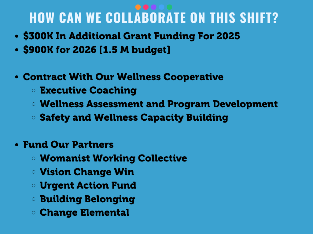 WHY: With Trumpism in power in the House, Senate, Supreme Court and many local governments movements face threats they are not currently equipped to handle. Fortunately, we have learned some lessons from the last Trump administration that, with funder resources, we can turn into practical movement infrastructure that can resist the destruction of movements and erosion of our freedoms. By partnering with movements capable of holding down aspects of this strategy we hope to support funders in getting money to where it is needed quickly and strategically.